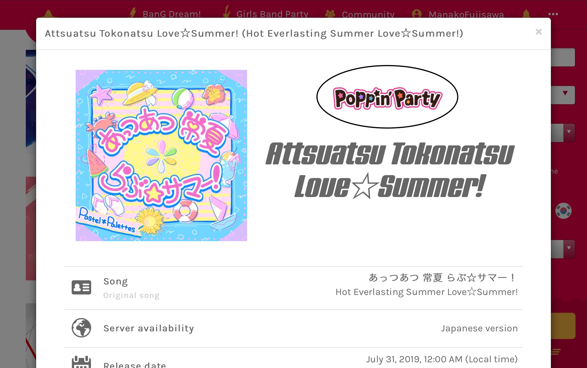 Dear db0, something was not right in this song because you still didn't change the band from Poppin'Party to Pastel*Palettes, and Poppin'Party does not play "Attsuatsu Tokonatsu Love☆Summer!". So don't let anybody know that Poppin'Party performs this song, because the cover says Pastel*Palettes performs this song.