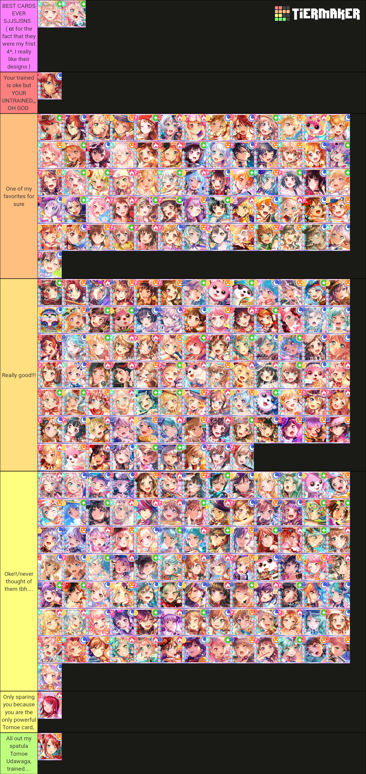 As you can see "Still got a lot to learn" and "My confidante" are my favorite 4 stars! Not only because they were my frist 4 stars and have a soft place in my heart and tier but also because.... Did you even see them? THEY ARE SO GOOD. Especially "My confidante", it is beautiful, my first card and also my favorite 4 star card if we don't include Eve's. Tomoe "walk down memory lane" is also great but her trained is oke, nothing special for me tbh, but I BREATHE FOR THE UNTRAINED, seeing that the image recalls the scene were Tomoe and Himari look at their childhood memories it's kinda cute, makes the event even better and also reminds me of how the I need you Kokoro untrained card makes the band story more special than it already was. The frist ones that appear one of my favorite tier are actually in order. That's it, got nothing to say now :')))