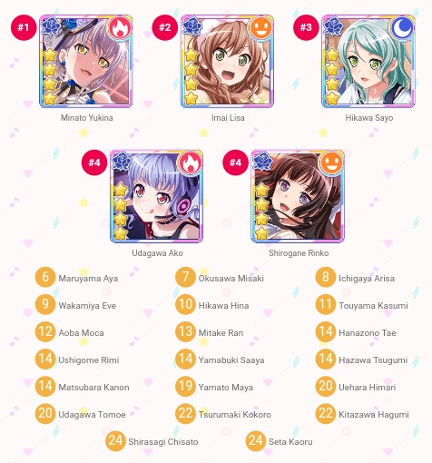 ofc Roselia is at the top c: (i love all the girls [expect kaoru. i had a dream she kidnapped me and now everytime i see her card in multilive i get so scared. not even joking])