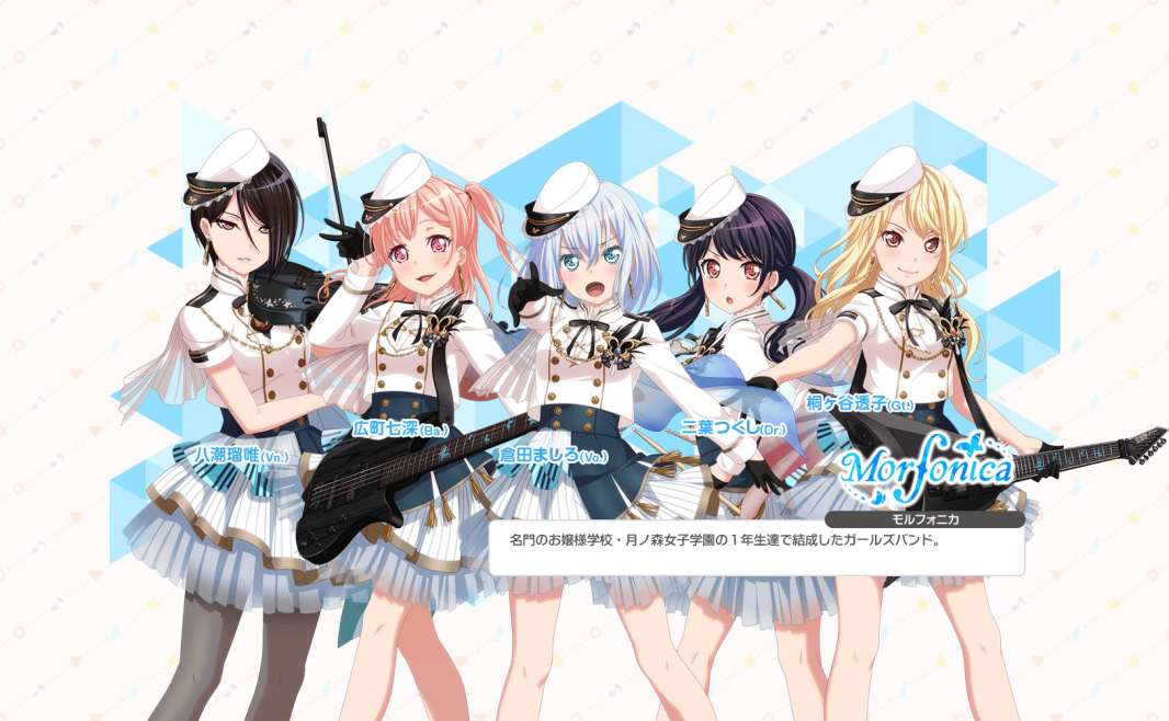 and MORFONICA. i highkey am loving their designs, even if nanami and tsukushi look a little like you fused a couple existing bandori girls together... but anyway i love all of them already, rui could kill me and i'd be okay with that, nanami is v pretty in a chisato sort of way but that creamy pink hair will kill me trying to color her, mashiro is reminding me a little of yukina but that's not a bad thing, tsukushi is CUTE even if her hair color confuses me (black or purple??), and i don't have much to say about touko but.......... pretty