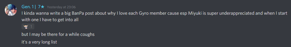 this segment feels like it's not making any sense but that's because Nayuta is incredibly hard to talk about?? he really shouldn't be, but he is?? I love his dedication, how hard he works, his brutal honesty, the depth of his emotions which we've really only seen in his songs up till now but are slowly unravelling with the stories, his interactions and how certain people (see Fuuta & Ren, did I mention I ADORE uni 1st yrs vocalist trio) can catch him off guard just like that ... and yet I can't really put it in words ... even going deeper into analysing him like I did the other Gyro members doesn't rly work because he's just Nayuta. I'm glad that he is, but he sure is being difficult even with me, huh ...