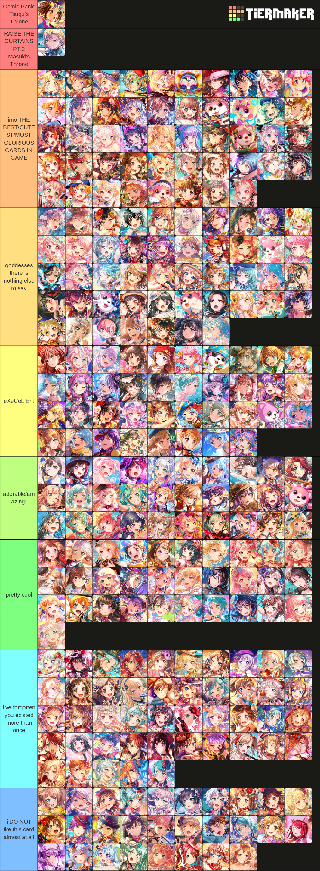 i have very unpopular opinions :') and trust me i didnt do it based on best girl because there's a moca card that's last tier and an eve card that's top tier after the thrones