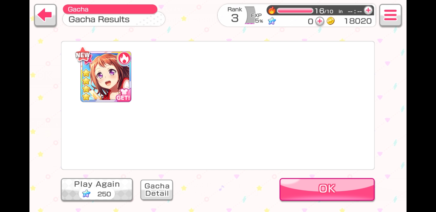 First Day of Bad Bear Gacha: spent about 29.4k stars and got a WHOLE bunch of 3 stars I never managed to scout for beforehand (and a lucky 7 3star pull!), but no Misaki and no other 4 stars whatsoever