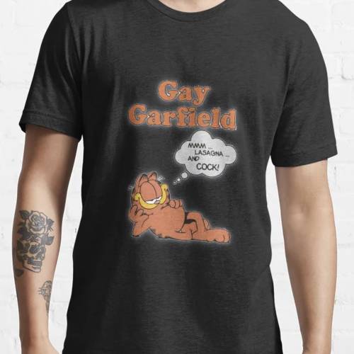 The striking design features of the Gay Garfield Shirt, which feature Garfield as the endearing main point, give it its visual appeal. Garfield is striking his signature easy attitude with a comical, inspirational air of self-assurance. The shirt's fanciful cloud-shaped pattern with the humorous tagline "Hmm, Lasagna and Cock!" adds a playful element to the design. The words "Gay Garfield" are presented above all else in a striking orange typeface that accentuates Garfield's fur, making this T-shirt a colorful and unforgettable item for anybody who dons it.